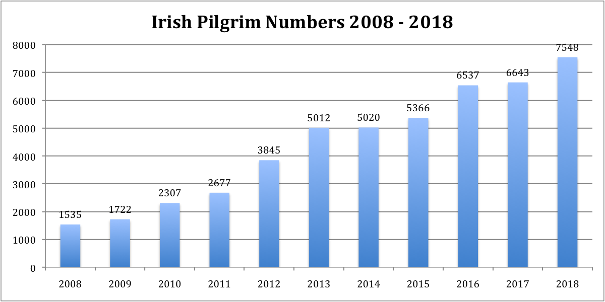 Once again the numbers show the popularity of the Camino among the Irish pilgrims. A record number of 7,548 Irish pilgrims arrived in Santiago in 2018, an annual growth of 13.6%, which outperforms the overall 8.7% growth from the previous year. Looking at the last 10 years, there has been an astonishing 392% growth in Irish pilgrims walking the Camino!