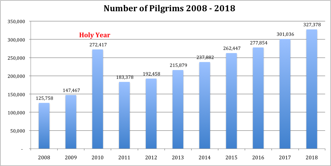 In 2018, a total of 327,378 people walked to Santiago and obtained a Compostela certificate, representing an increase of 8.7% on 2017.