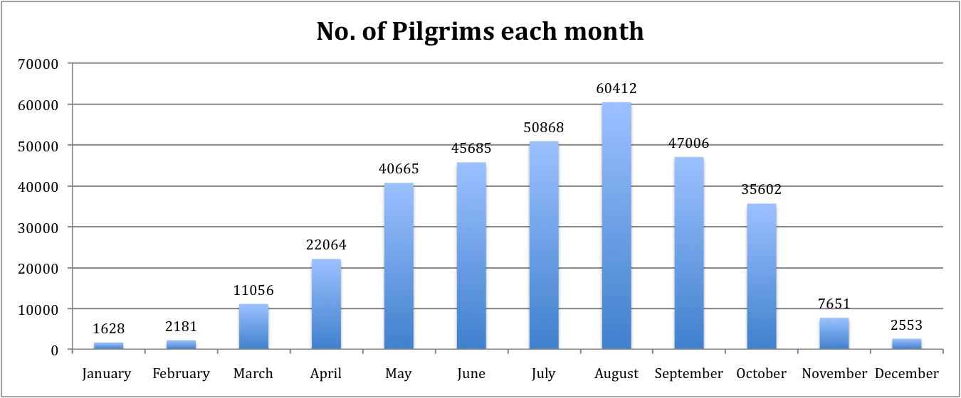 July and August remain the most popular months to walk the Camino. 60% of the pilgrims who walked during these months were Spanish. The most popular months for foreign pilgrims were May, June and September with over 28,000 foreign pilgrims walking in each of these months, representing over 70% of the total number of pilgrims. The most popular month for Irish pilgrims to walk was September with 1,485 collecting their Compostela.